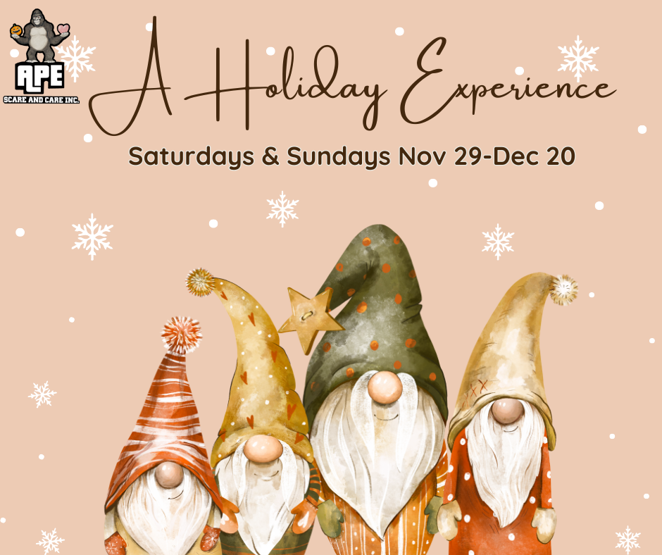 Get ready to step into a winter wonderland! A.P.E. Scare & Care invites you to our new Holiday Experience, a festive walk-through maze of beautifully decorated Christmas and holiday-themed rooms. Filled with enchanting lights, festive decorations, and holiday cheer, this is the perfect way to get into the holiday spirit. It’s an unforgettable adventure designed for the whole family.